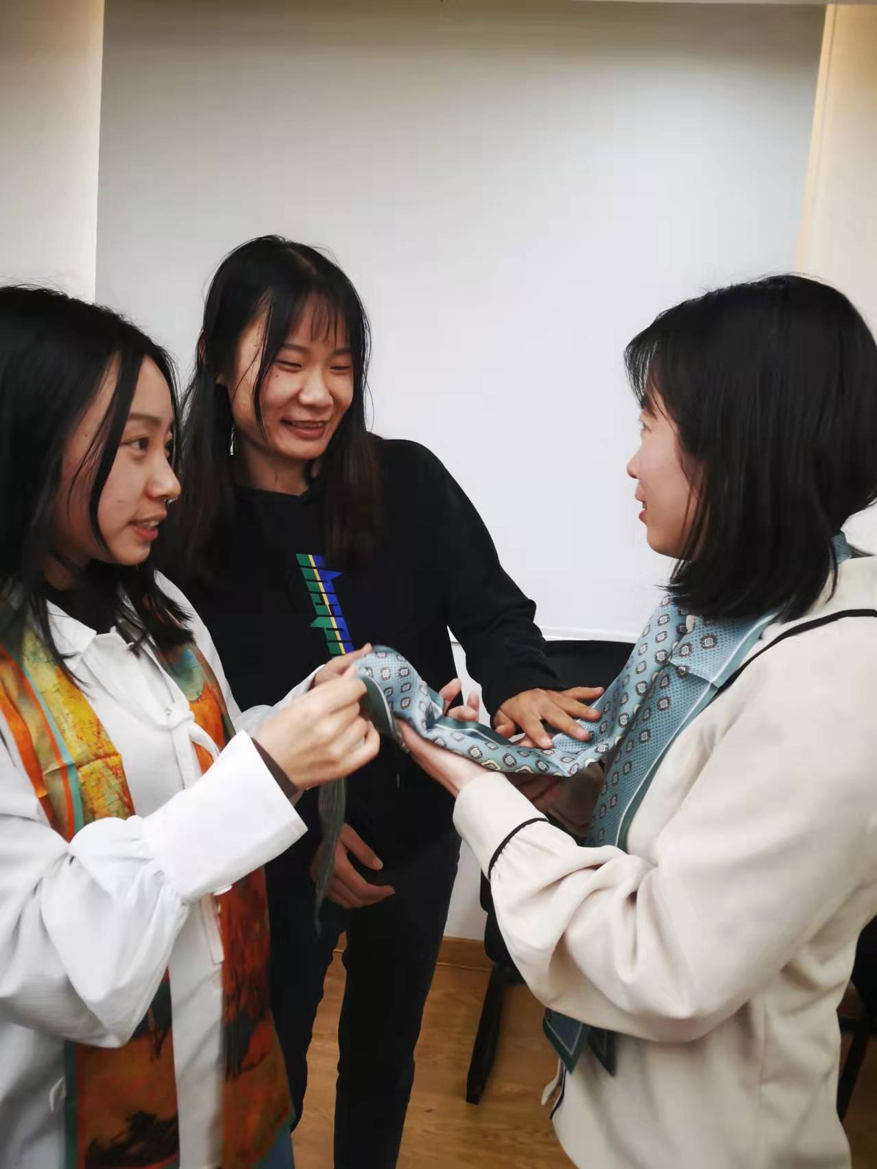 大家快樂地打開“絲巾”盲盒后,一起學(xué)習(xí)了多種系絲巾方法。大家享受著搭配色彩、設(shè)計造型、相互系絲巾帶來的樂趣和美好體驗,展示著各自的才藝。