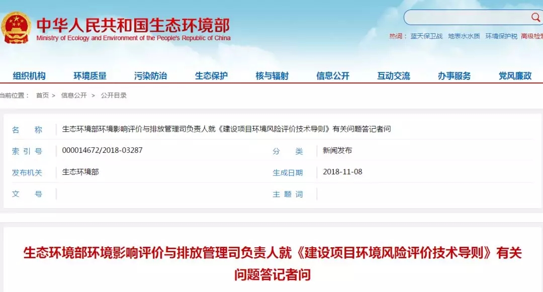 生態(tài)環(huán)境部日前印發(fā)了《建設項目環(huán)境風險評價技術(shù)導則》(HJ169-2018)(以下簡稱《風險導則》),生態(tài)環(huán)境部環(huán)境影響評價與排放管理司負責人就《風險導則》修訂的背景、思路及內(nèi)容等有關(guān)問題回答了記者的提問。